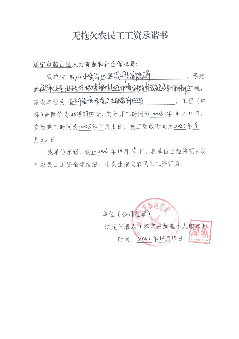 2025年11月19日,遂宁市船山区人力资源和社会保障局收到施工总承包单位四川中宏昇达建设工程有限公司提交无拖欠农民工工资承诺书,申请撤销农民工工资专用账户及返还农民工工资保证金保函。根据《工程建设领域农民工工资保证金规定》《遂宁市工程建设领域农民工工资保证金经办规程》相关规定,现对其承建的遂宁市(安居)生活垃圾填埋场生态环境问题整改应急项目(堆体成型)项目无拖欠农民工工资情况进行公示。公示期满,未发现用人单位有拖欠、克扣农民工工资行为的,我局将按规定程序办理撤销农民工工资专用账户及返还农民工工资保证金保函。
