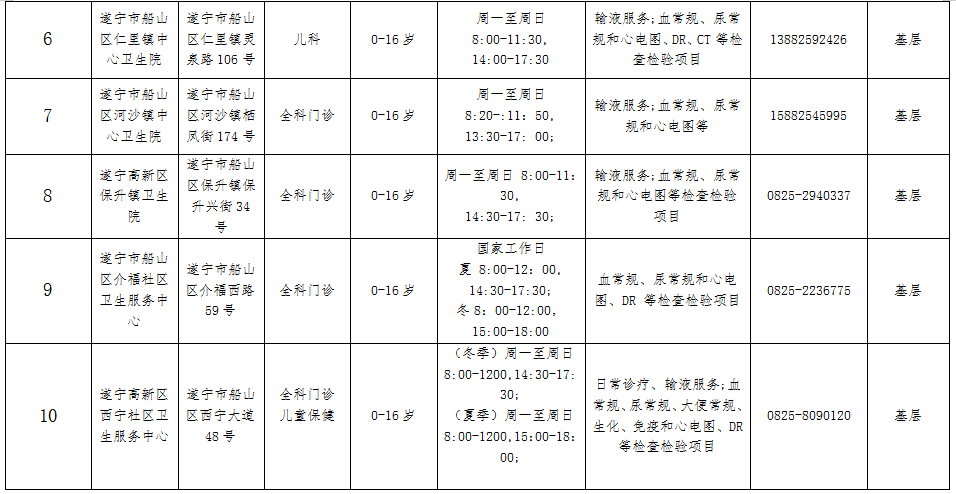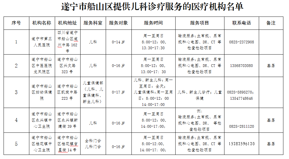 为更好地满足区域内儿童就医需求,提供更专业、便捷的儿科医疗保障,现将遂宁市船山区提供儿科门诊服务医疗机构、时间和电话公示如下。