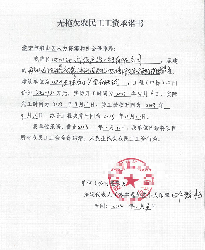 2024年12月23日,遂宁市船山区人力资源和社会保障局收到施工总承包单位四川汇源顺建设工程有限公司提交无拖欠农民工工资承诺书,申请撤销农民工工资专用账户相关手续。根据《工程建设领域农民工工资保证金规定》《遂宁市工程建设领域农民工工资保证金经办规程》相关规定,现对其承建的遂宁市船山区联盟河流域(永河园片区)水环境综合治理河道生态修复工程无拖欠农民工工资情况进行公示。公示期满,未发现该项目有拖欠、克扣农民工工资行为的,我局将按规定程序办理撤销农民工工资专用账户及返还农民工工资保证金。