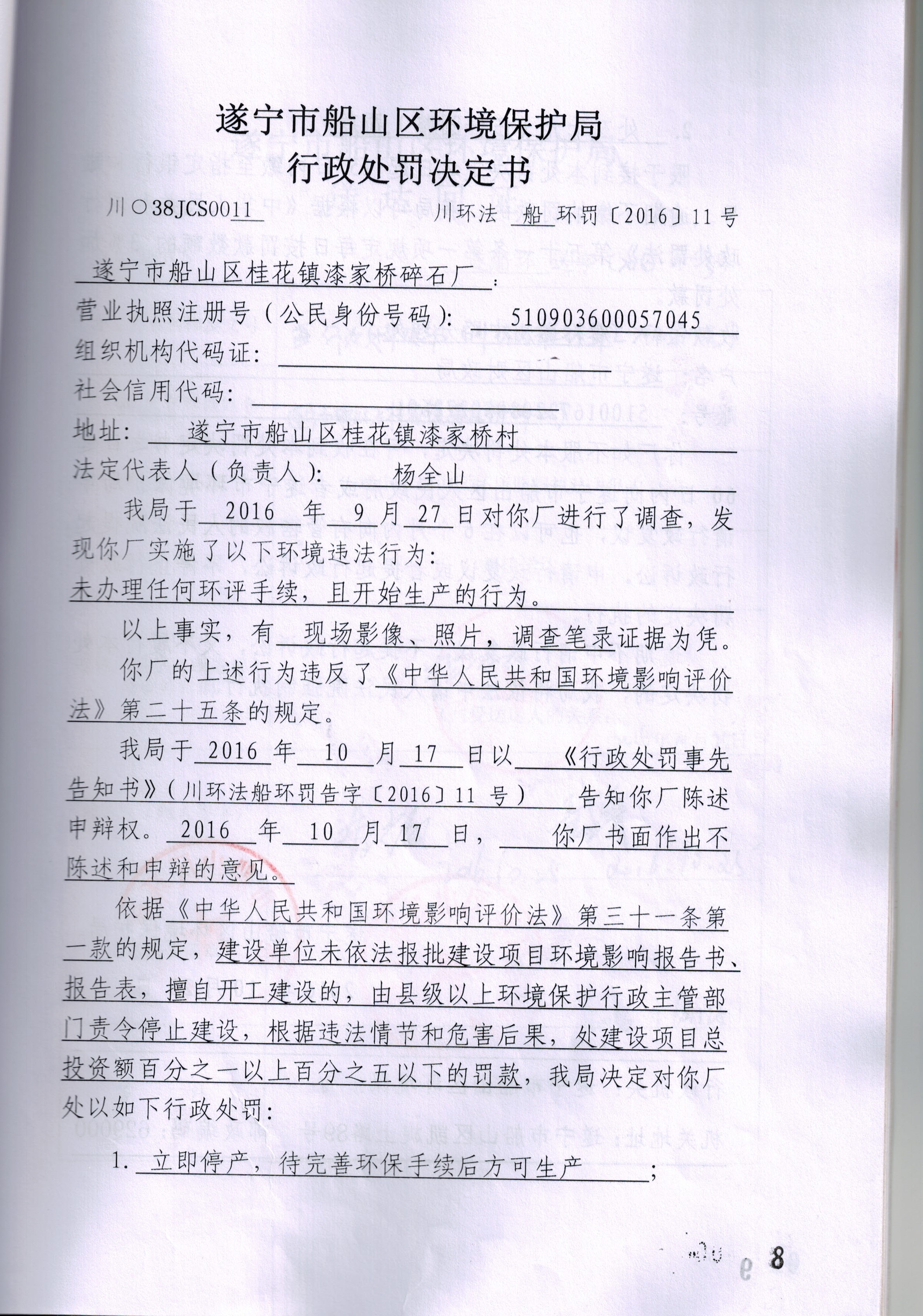 遂宁市船山区桂花镇漆家桥碎石厂行政处罚决定书