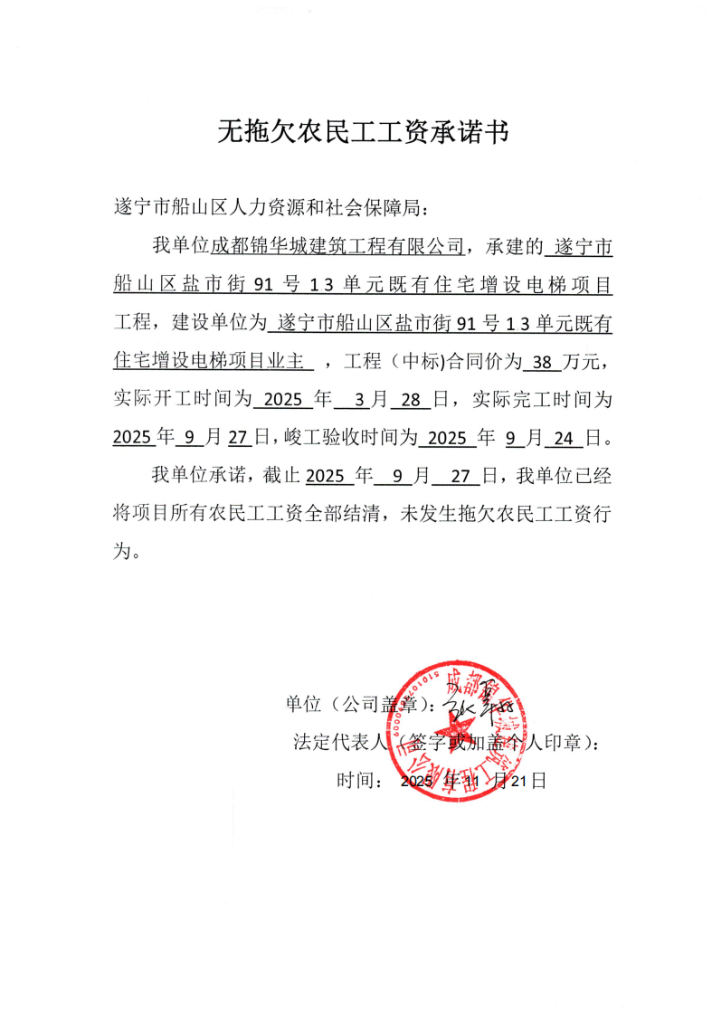2025年11月24日,遂宁市船山区人力资源和社会保障局收到施工总承包单位成都锦华城建筑工程有限公司提交无拖欠农民工工资承诺书,申请撤销农民工工资专用账户及返还农民工工资保证金保函。根据《工程建设领域农民工工资保证金规定》《遂宁市工程建设领域农民工工资保证金经办规程》相关规定,现对其承建的遂宁市船山区盐市街91号1、3单元既有住宅增设电梯项目无拖欠农民工工资情况进行公示。公示期满,未发现用人单位有拖欠、克扣农民工工资行为的,我局将按规定程序办理撤销农民工工资专用账户及返还农民工工资保证金保函。