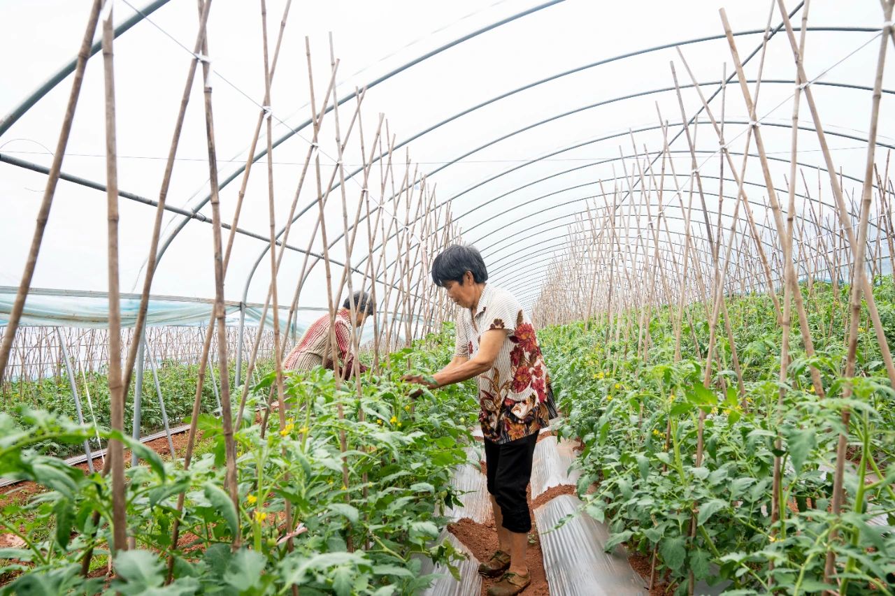 相邻大棚里,几位村民指尖翻飞,娴熟地为正在生长的番茄苗打掉侧枝。“枝叶疏朗,这样养分才能更好地流向果实。”村民解释着说。