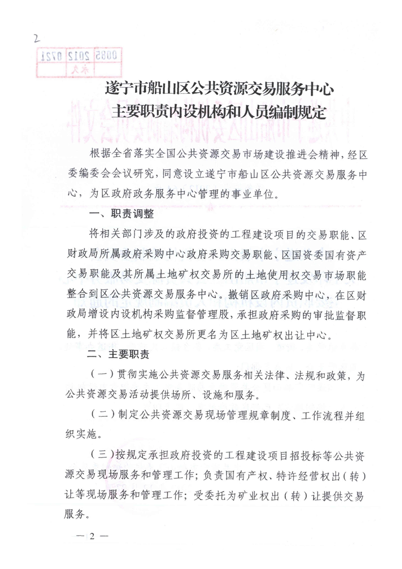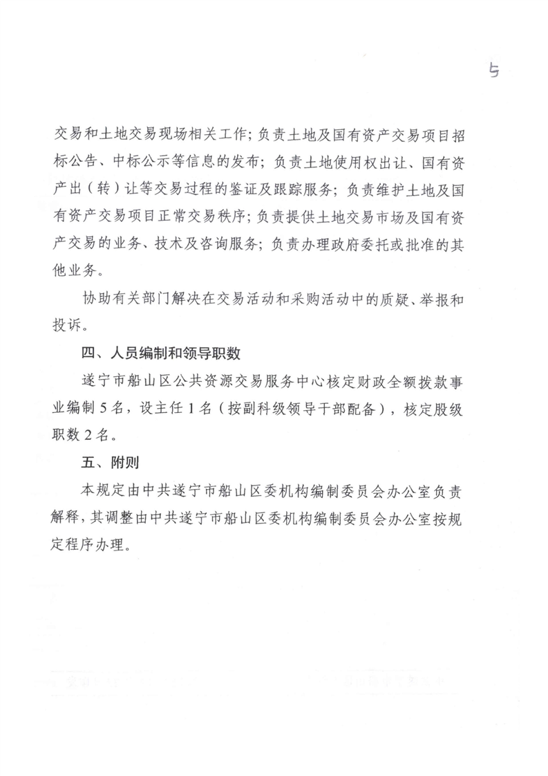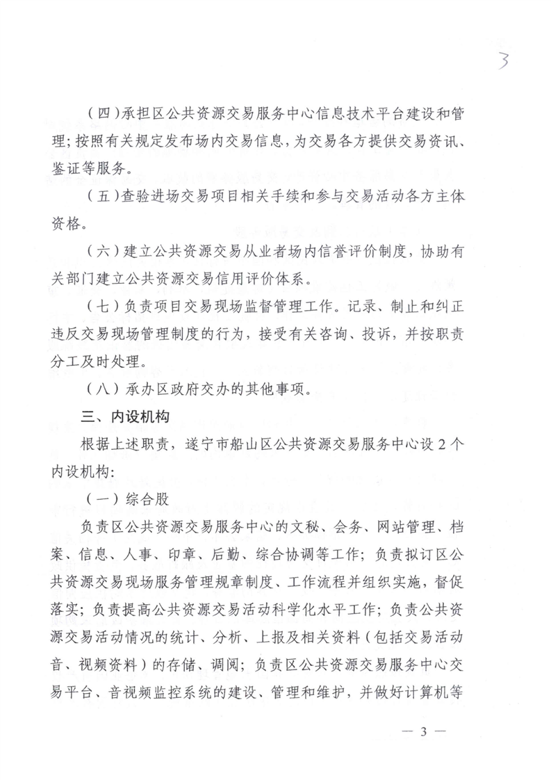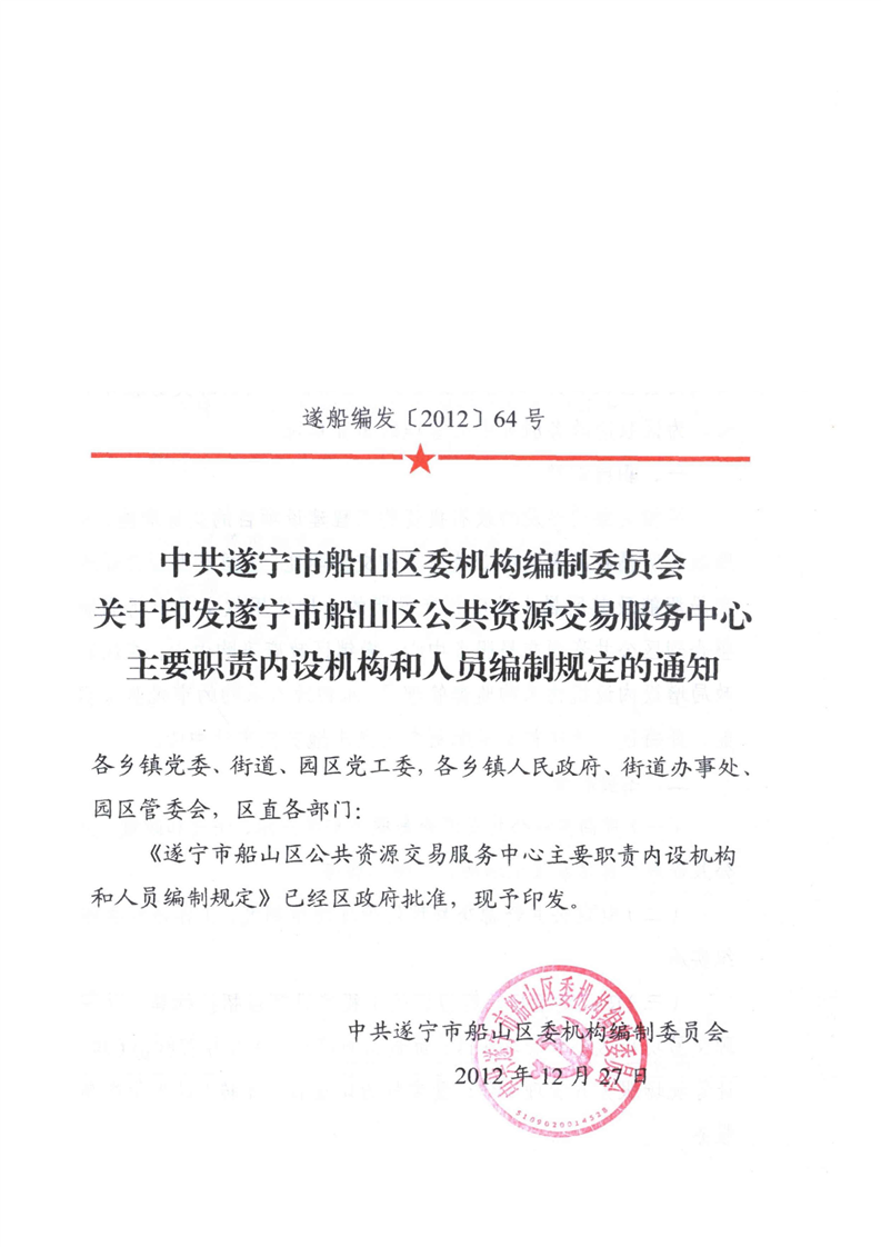 中共遂宁市船山区委机构编制委员会关于印发遂宁市船山区公共资源交易服务中心主要职责内设机构和人员编制规定的通知