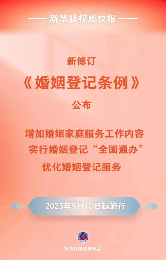 4月9日,新修订的《婚姻登记条例》公布,自2025年5月10日起施行。