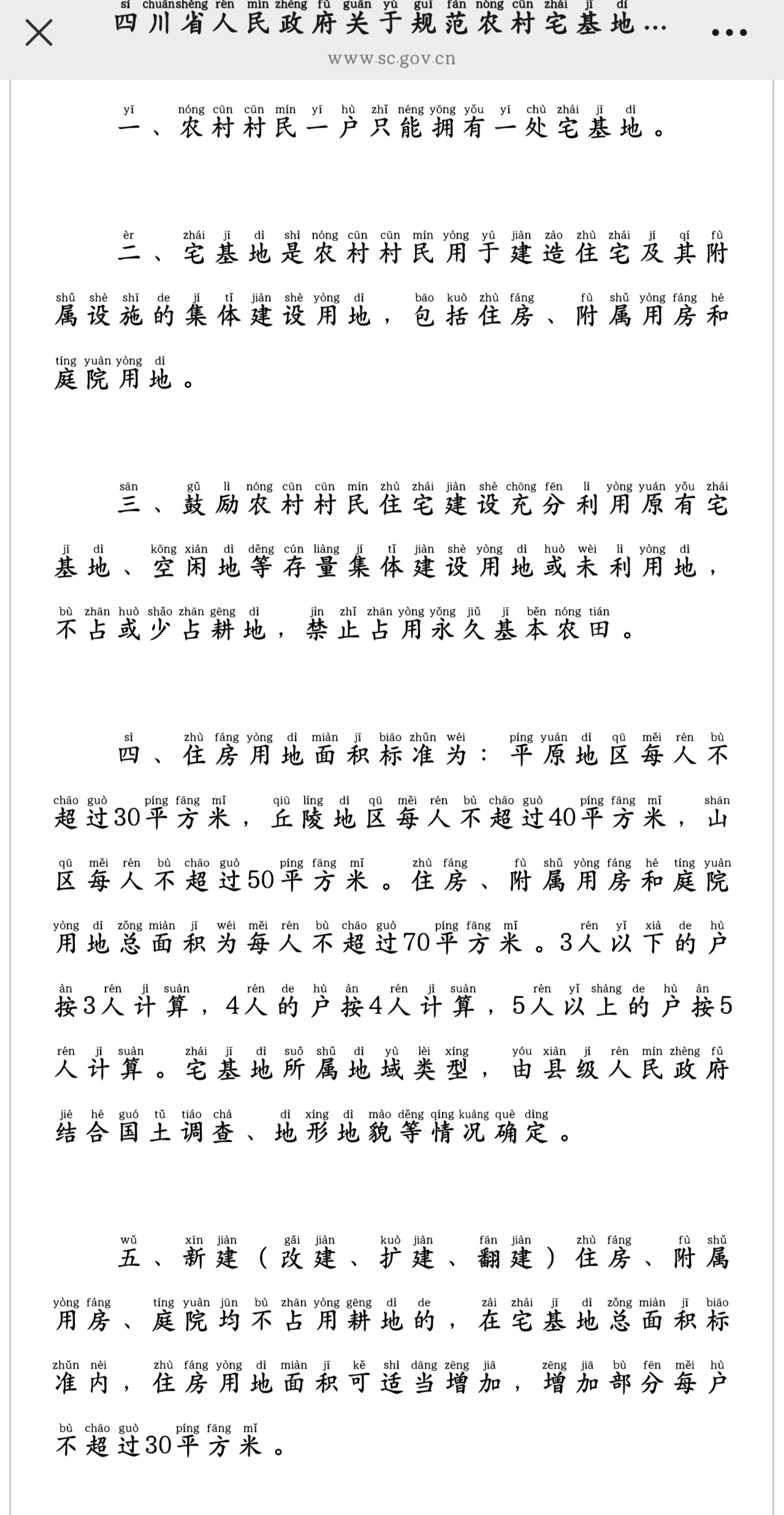 我是仁里镇文笔村2社村民,我查阅到川府规第四号文件中规定的住房用地面积标准为:平原地区每人不超过30平方米,丘陵地区每人不超过40平方米,山区每人不超过50平方米。住房、附属用房和庭院用地总面积为每人不超过70平方米。3人以下的户按3人计算,4人的户按4人计算,5人以上的户按5人计算。