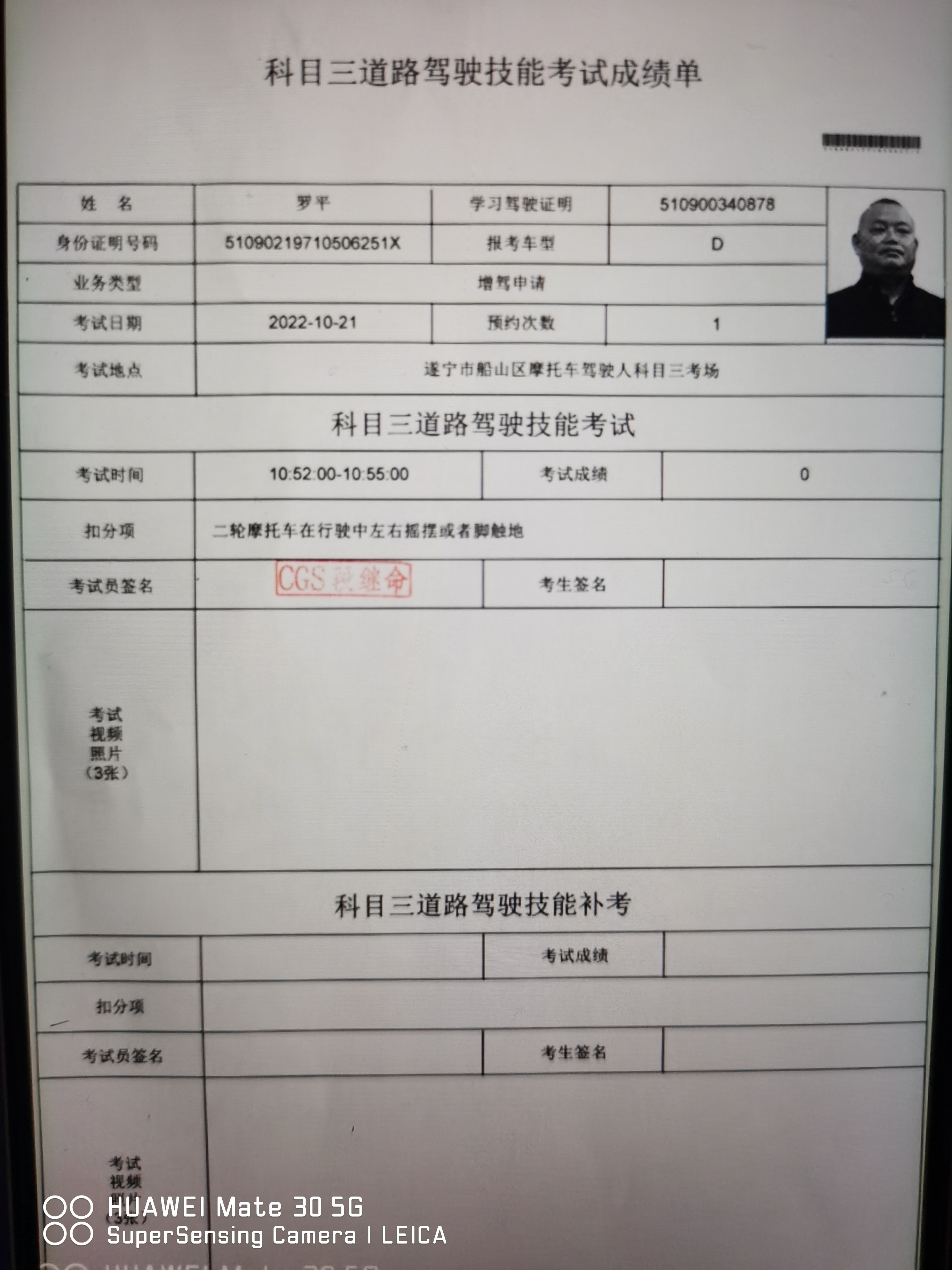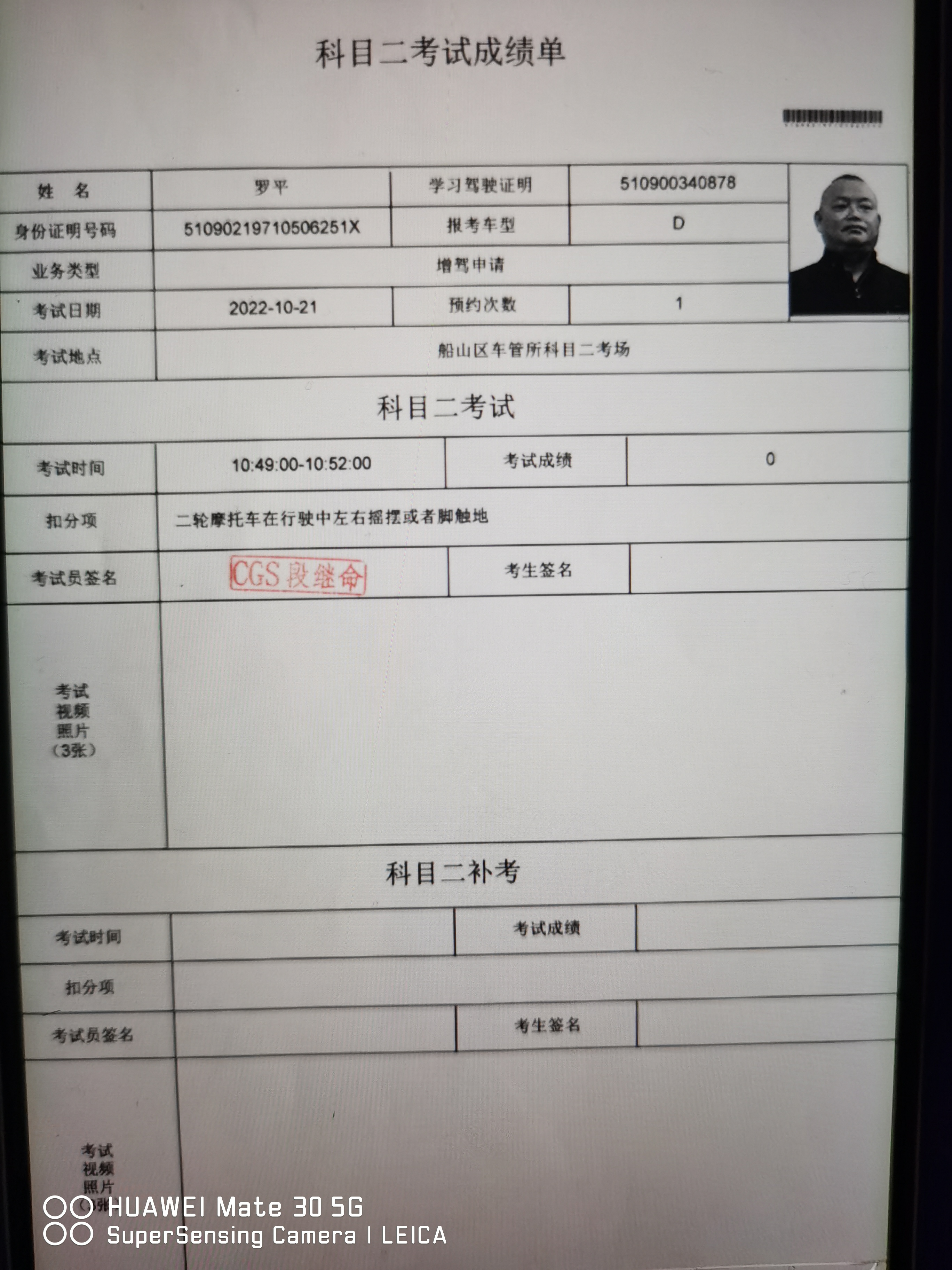 3、2022年10月21日考试后,考试员在扣分项留的考试结果是:二轮摩托车在行驶过程中左右摇摆或者脚触地,分数竟然是为0分,怎么考也不会是0分吧。我明明是考的三轮车科目二,怎么成了二轮摩托车字眼,我是不是可以这样理解,第一次考试我已经通过,考试员找不到合适的理由,考试员胡乱编一个,确让我又来补考,是否存在车管所领导授权来敛财?不知道多少考驾照的人遭受此经历。