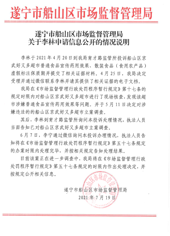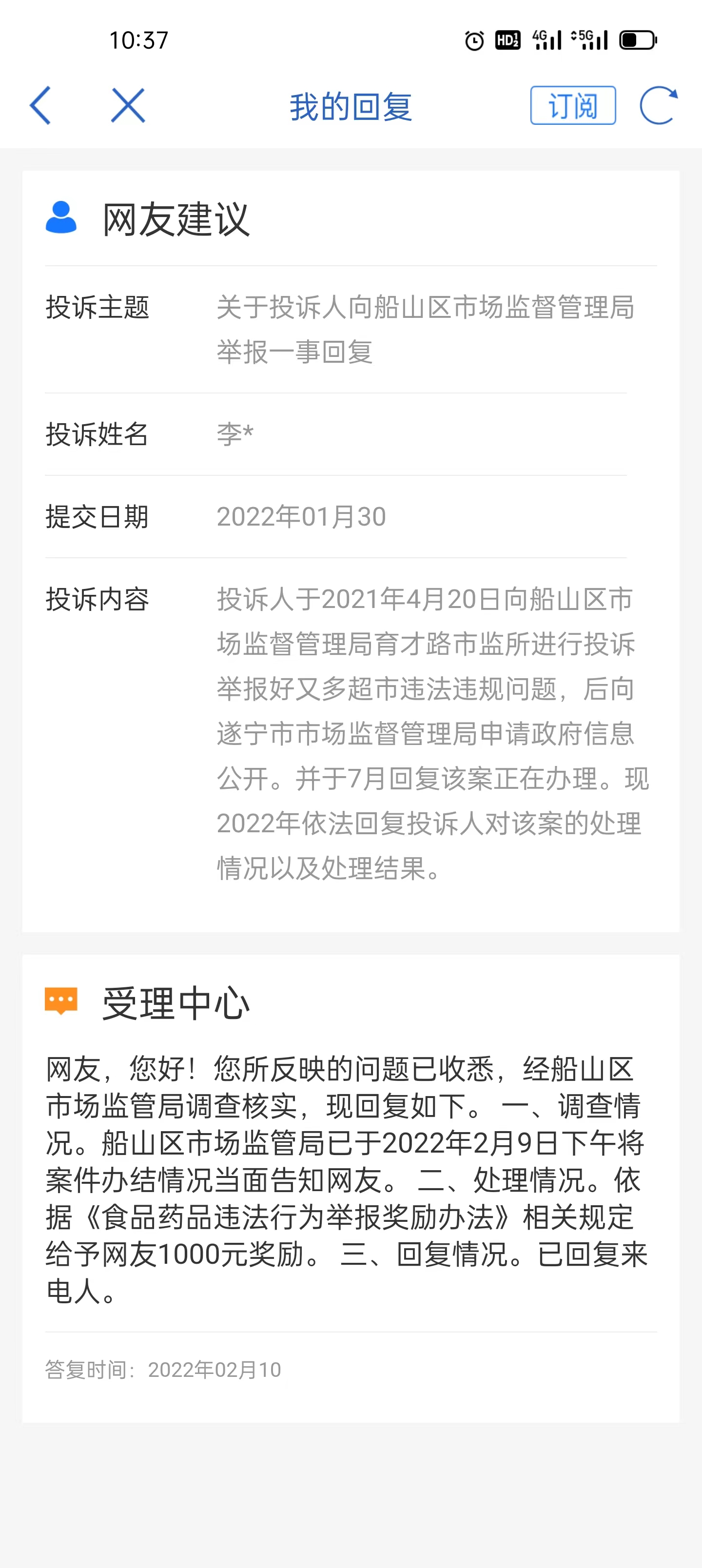 本人于2020年4月20日到船山区市场监督管理局进行了举报好又多超市的违法行为,又反馈得知立案调查并且作出了处罚,后本人向贵局提交了举报奖励申请但是一直未回复,于1月再次向船山区市场监督管理局投诉奖励之事,后工作人员联系我到局里签署了相关的文件,到现在2020年4月14日该奖励还未到账,依据当时适用《食品药品违法行为举报奖励办法》各级政府应当设立专项奖励资金预算,现在我联系之前工作人员回复是由于国库一直没有批准导致还未到账,现在已经严重超出时效,请财政和监管局处理该奖励事宜