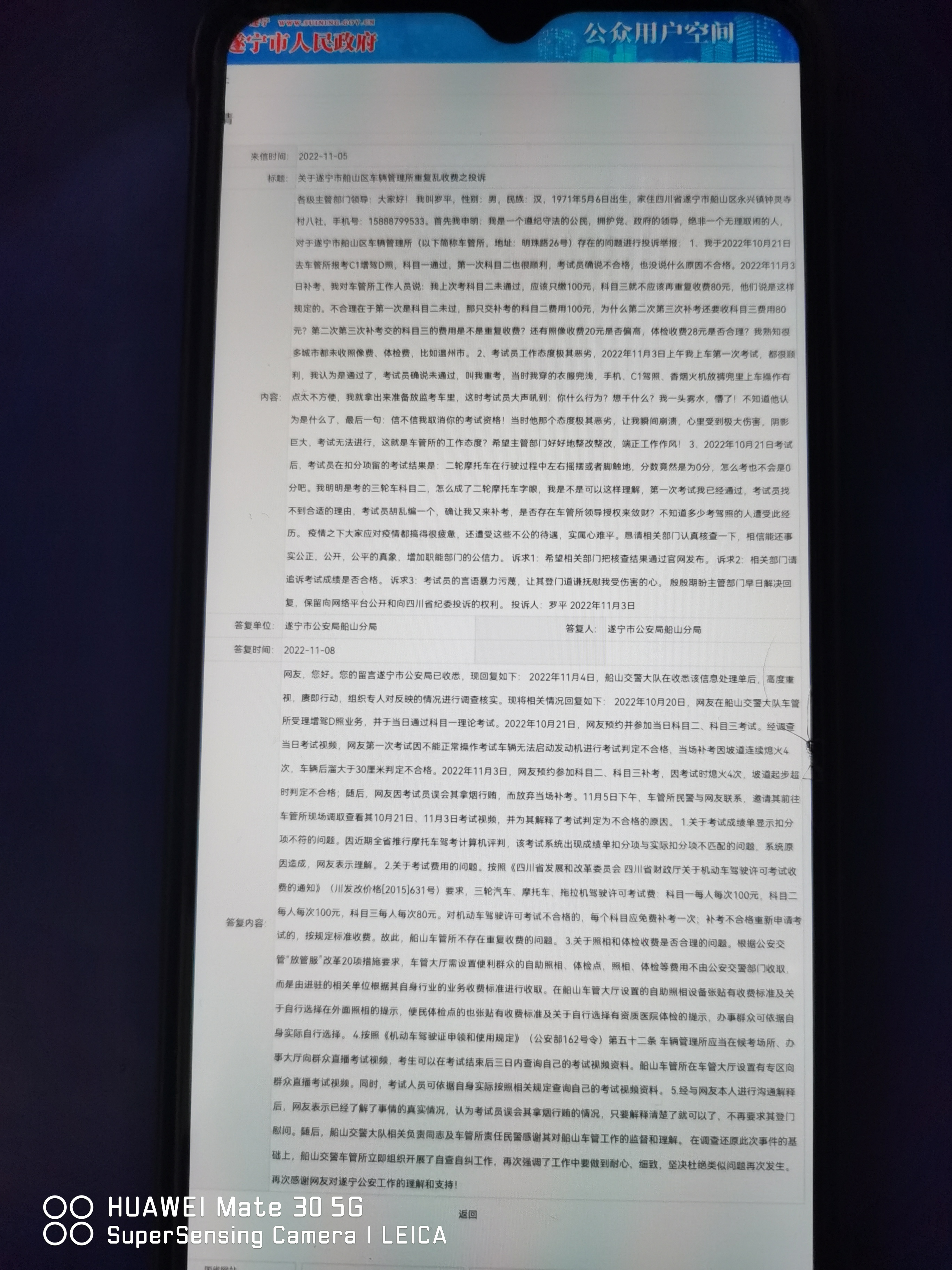 11月5日《关于遂宁市船山区车辆管理所重复乱收费之投诉》投到遂宁市委书记信箱、遂宁市船山区书记信箱、遂宁市市场监督管理局等等相关领导,得到了及时回复,感谢领导们的关心与关注,我十分相信事件会得到圆满处理!