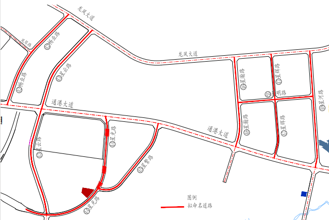 43 | 星云路 | XINGYUN LU | 北起龙凤大道,经通港大道,南至星光路。 | 36 | 1659 | 该道路是连接绿色低碳产业园和循环经济产业园的主要通道,紧靠川职院龙凤产学研园区,为“星”系列道路,“星云”意指呈云雾状的发光天体,寓意文才杰出者众多如云,寄望于大学莘莘学子人才辈出、群星闪烁,建议命名为“星云路”。 | 拟建 |