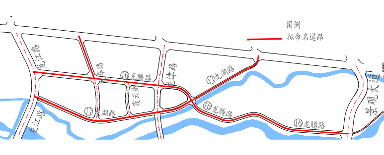 17 | 龙湖路 | LONGHU LU | 东起中环线,经龙腾路、霞云街、龙华路,西至龙江路。 | 12-22 | 1339 | 该道路位于高新船山园区核心区,属“龙凤”古镇周边,紧邻拟建的两河公园,寓意“湖光春色”,建议命名为“龙湖路”。 | 部分在建 |