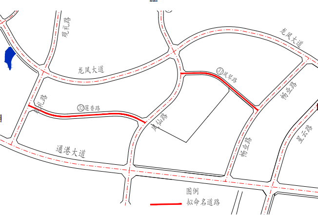 序号 | 拟命名道路名称 | 罗马字母拼音 | 起止点 | 宽度 (米) | 长度 (米) | 拟命名理由 | 备注 |