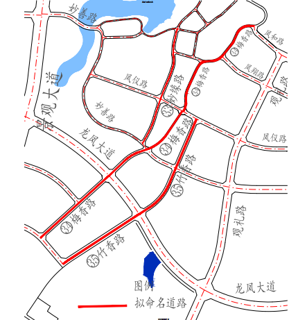38 | 凤舞街 | FENGWU JIE | 北起凤和路,南至凤翔路。 | 16 | 135 | 该道路位于高新船山园区核心区,典出成语“龙飞凤舞”“鸾歌凤舞”,寓意“吉祥如意,事业升腾”,建议命名为“凤舞街”。 | 拟建 |