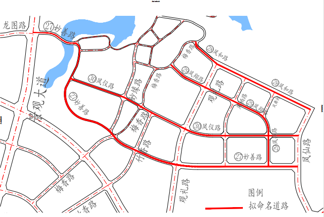 36 | 观礼路 | GUANLI LU | 北起凤和路,经凤翔路、凤仪路、妙善路、龙凤大道、莲香路,南至通港大道。 | 30-36 | 1424 | 该道路位于高新船山园区核心区,典出唐·滕珦《释奠日国学观礼闻雅颂》“太学时观礼,东方晓色分”,寓意“观礼之仪”,注重传统和历史,建议命名为“观礼路”。 | 拟建 |