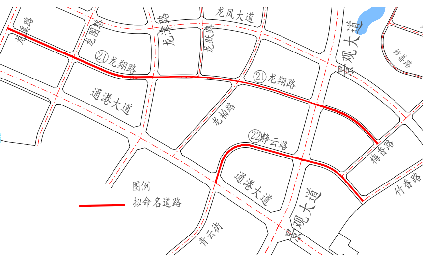 22 | 静云路 | JINGYUN LU | 东起竹香路,经梅香路、景观大道,西至通港大道与青云街平交口。 | 20 | 757 | 该道路位于高新船山园区核心区,属“龙凤”古镇周边,以“舒、静、青、香”共同描绘“舒适闲静、青云缥缈、香气四溢”的美好画面,与“云”相配,组成系列道路名称,建议命名为“静云路”。 | 拟建 |