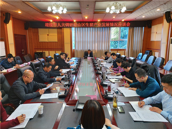 4月14日,市人大常委会副主任施瑞昶带队调研船山区生猪产业发展情况。区人大常委会副主任张甲武、副区长郑良以及区农业农村局、桂花镇相关负责人陪同调研,区人大常委会主任蒲体德参加座谈会。