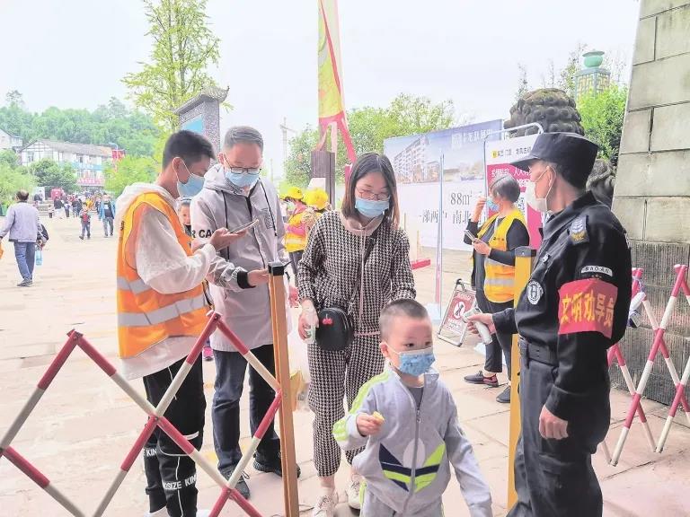古镇内,6人一队的文明劝导员不停地巡逻着,他们主要为游客提供帮助和进行不文明行为劝导。“假期期间,古镇景区增加了35个安保力量,并设置了多个宣传点位,提醒游客佩戴口罩,文明出行。”遂宁高新区船山园区景区事务部部长刘小英介绍。