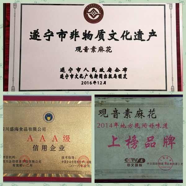观音素麻花是遂宁市非物质文化遗产之一,产品曾获得“中国四川新春年货购物节金奖”,“遂宁市十大名优产品”,“四川知名土特产品牌”等多项殊荣,产品作为遂宁观音历史文化符号之一被 CCTV-4(中文国际频道)《江河万里行》栏目,SCTV-4(四川卫视)等多家媒体报道。