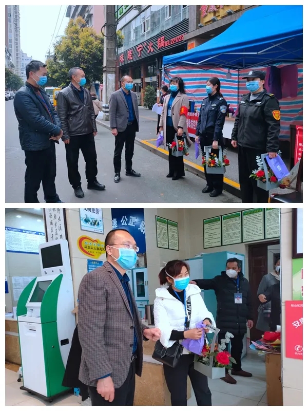 “妇女节到了,你们辛苦了,祝你们节日快乐!”3月7日下午,在第110个“三八”国际劳动妇女节到来之际,区人大常委会副主任陈懿、区政协副主席邓军以及介福路街道党工委、办事处班子成员分别来到老盐关社区、北小区社区、嘉禾桥社区各防疫卡点,看望慰问奋战在抗疫一线的妇女同胞,对她们在疫情防控工作中舍小家、顾大家,为保护辖区人民群众生命健康安全做出的贡献表示衷心感谢,并反复叮嘱她们在开展疫情防控、复工复产的同时做好自我防护,以健康的身体积极投入战斗,为打赢这场疫情防控阻击战贡献巾帼力量。