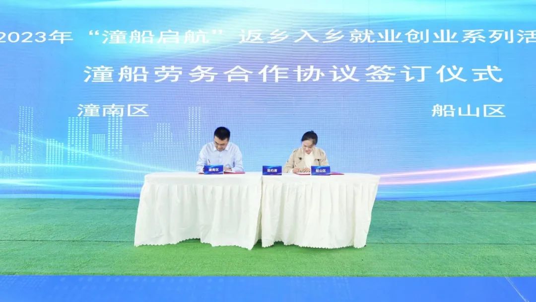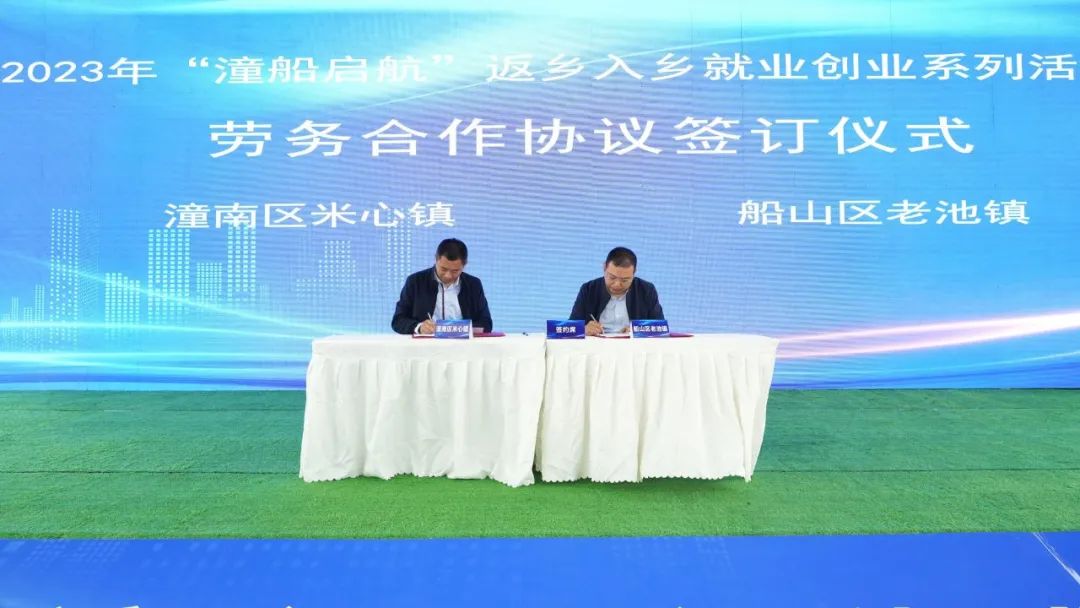 在活动现场,潼南区就业和人才中心与船山区农民工服务中心、潼南区米心镇与船山区老池镇分别签订了劳务合作协议,两地将通过联动搭建招聘求职平台,加强岗位供需精准对接,拓展人才交流合作,开展多领域协作,实现两地人力资源优势互补、相互支持、长期合作、共同发展。