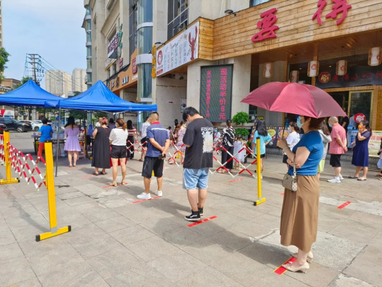 从23日早上6点30分开始,在船山区的大街小巷、部分小区内,工作人员指引市民们有序排队,等待接受核酸检测,炎热的天气下队伍秩序始终有序平稳,使得采样效率更高。采样结束后,居民群众再依次有序离开,整个流程紧张有序、忙而不乱。