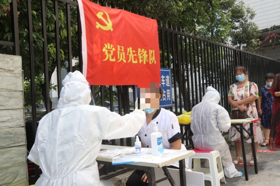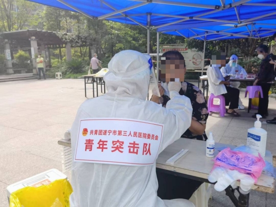 在核酸检测现场,党员医务人员充分发挥党员先锋模范作用,把初心和使命践行在行动和岗位上,在抗击疫情的各个战场构筑起坚固的“红色堡垒”,坚决用“党员红”守护遂宁人民群众的“健康绿”。由党员和团员青年组成的青年突击队也积极响应,投身全员核酸检测工作,同心协力筑牢疫情防控的坚固防线。
