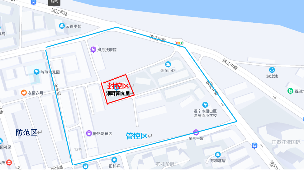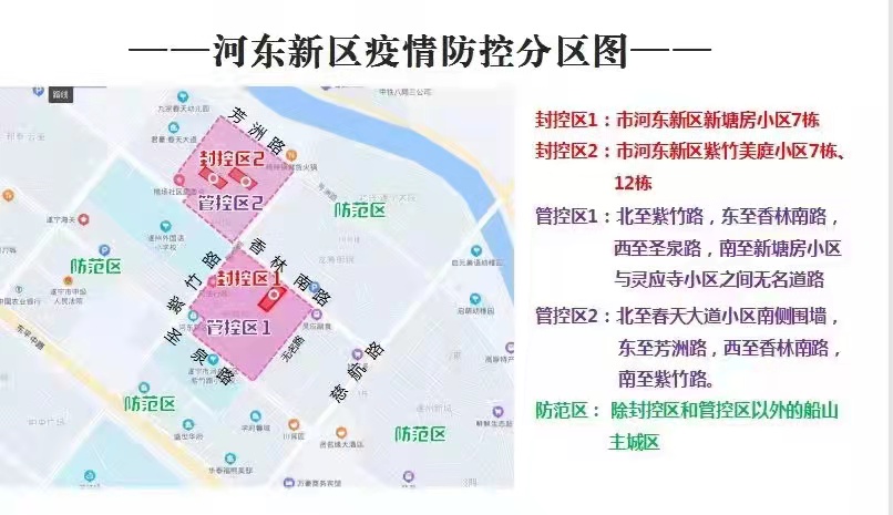 在已划定船山区永乐街湖畔阳光里宿舍小区为封控区的基础上,新划分市河东新区新塘房小区7栋、市河东新区紫竹美庭小区7栋和12栋为封控区。