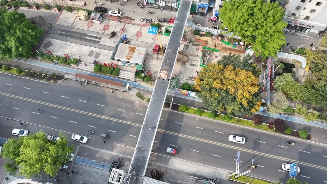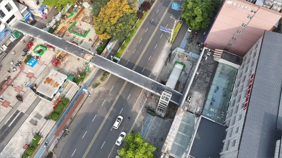 目前已完成主体工程建设,正处于桥面装修装饰阶段电梯、步梯也在同步施工安装。