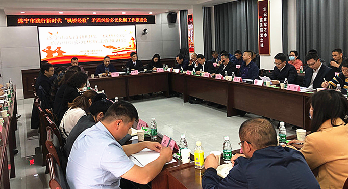 日前,遂宁市践行新时代“枫桥经验”矛盾纠纷多元化解现场推进会在船山区召开。市退役军人事务局党组书记、局长肖舰,市退役军人事务局党组成员、副局长梁腾飞,市退役军人事务局党组成员、市退役军人服务中心主任舒天忠,各县(市、区)、市直园区退役军人事务部门分管负责人,各县(市、区)、市直园区退役军人服务中心主任及相关工作经办人、船山区各乡镇、街道退役军人事务工作分管负责人、退役军人服务站站长参加会议。