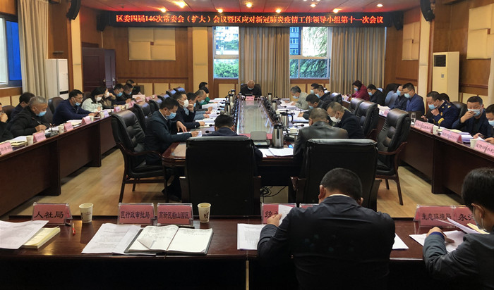 4月22日,区委书记、区应对新冠肺炎疫情工作领导小组组长曹斌主持召开区委四届146次常委会(扩大)会议暨区应对新冠肺炎疫情工作领导小组第十一次会议。区委副书记、区长、区应对新冠肺炎疫情工作领导小组组长韩麟,区委副书记袁旭,区委常委向诚、程康、黄钰、陈发友、谢超、康合军、廖锦标、刘冰万出席会议。区人大常委会主任蒲体德,区政协党组书记、主席提名人选易志昂列席会议。