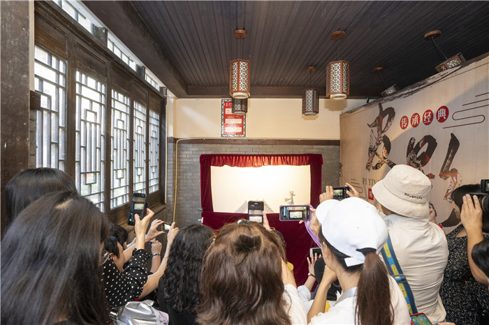 在古镇的皮影店里,一出结合现代流行词与四川话的新式皮影戏吸引了嘉宾们的关注。在短短两分钟的表演里,嘉宾们的掌声与欢笑声此起彼伏,整个皮影店洋溢在欢乐的气氛中……