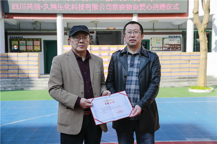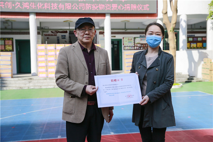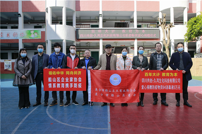 3月31日,四川共创·久鸿生化科技有限公司爱心捐赠仪式在盐关街小学举行。该公司在区工商联的组织下,向船山区教体系统捐赠价值5万元的84消毒液7.13吨,这些物资将用于全区47所公办学校和幼儿园、57所民办幼儿园和19家区工商联会员培训学校、幼儿园,助力各学校、幼儿园开学复课。