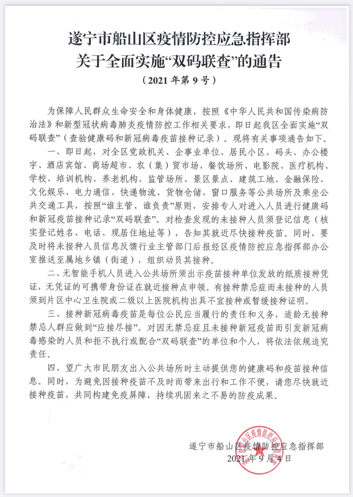 遂宁市船山区疫情防控应急指挥部关于全面实施“双码联查”的通告(2021年第9号)