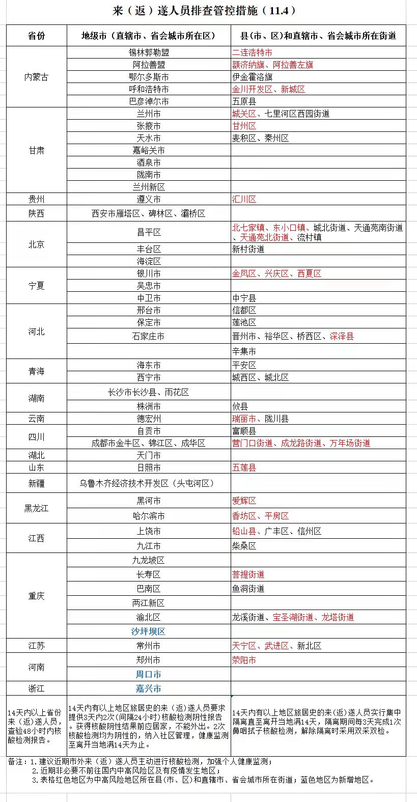 11月4日,遂宁市针对中高风险地区来(返)遂人员排查管控制定了相应的措施。