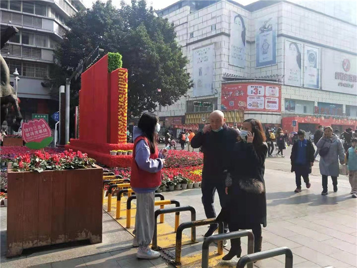 “您好,请出示一下健康码!”春节假期的遂宁中央商务区,市民游客熙来攘往。人群中,一群身穿红马甲的志愿者们忙忙碌碌,助力疫情防控,他们的身影格外引人注目,形成了一道靓丽的“风景线”。