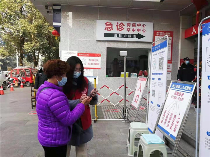 这个春节假期,记者在船山的街头巷尾、医院、商超、农贸市场等场所看到,志愿者们有的吹着口哨、有的手持喇叭,开展防疫知识宣传,提醒市民群众勤洗手,出门戴口罩,并教会市民们如何正确使用“四川天府健康通”。