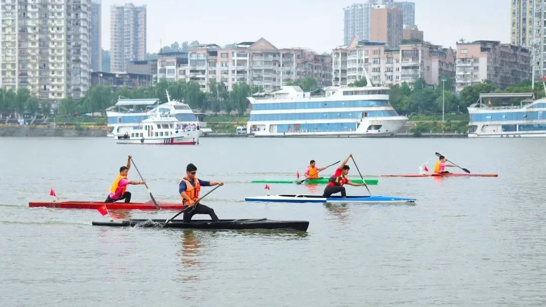 5月1日这天,2024年“庆五一”川渝观音湖水上项目展演赛在船山区圣莲岛举行。来自遂宁、重庆潼南、南充、内江、广安、 广元6支代表队的108名运动员展开紧张激烈的水上竞技。他们在尽情感受水上运动魅力的同时,也为现场市民游客上演了一场“百舸争流”的视觉盛宴。