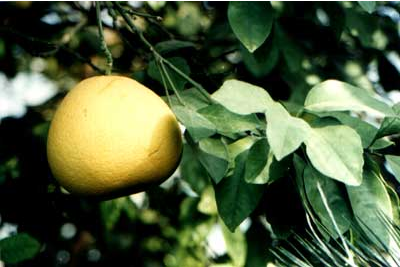 该柚系多年生常绿乔木,树势强,树冠自然圆头形,较开张。枝条粗壮直立,成年树和老树多斜生,枝刺退化或无。叶椭圆形,先端缓尖,叶面平滑,叶脉凸,叶片大而厚,叶缘具钝锯齿,叶柄翅较小,倒三角状,叶色较浓绿。花多朵排成聚伞花序,或单生;花萼4-5浅裂,被毛;花瓣近匙形,开花时反曲,雄蕊比花瓣短,子房球形。果实梨形或倒卵形,果蒂基部略下陷,有较明显的粗放射状沟纹,果蒂一边略高。果皮较厚,一般1.8cm左右。成熟后,外果皮金黄色,油细胞粗,微凹凸不平,海绵层白色。囊瓣壁薄,白色,11-13瓣,以12瓣居多,呈梳子形易分离。汁胞纺锤形,较大,油浸米黄色,晶莹透亮。果肉脆嫩化渣,酸甜爽口。一般单果重1000克左右,最重可达2000克以上,耐贮运。
