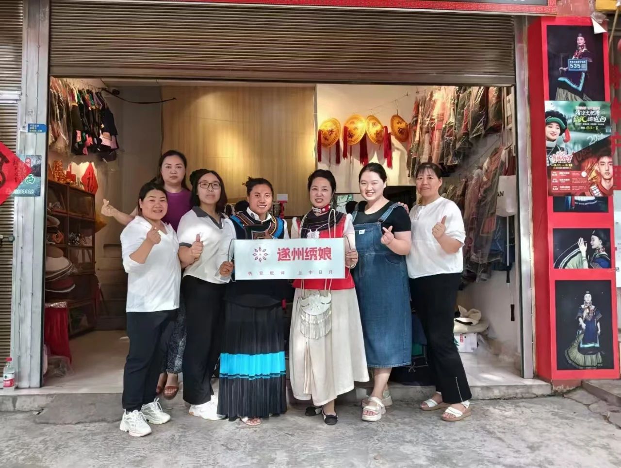 “蜀绣绣品多以莲花等图案为主,寓意着平安、祥和;因而,蜀绣在坊间,寄托着人们对美好生活的向往和追求。”这是2024年10月蒲彩虹向马来西亚师生团队介绍推广蜀绣作品的一个小片段。为让蜀绣被更多人知晓,蒲彩虹所在的遂宁市妙善文化艺术坊探索创新“1+2+3”模式”:“1个核心技术”是破细丝斜平针法的创新,通过极细丝半通透的整体表达,使得绣品具有与众不同的通透灵动,更重要的是实惠的价格解决了绣品因价格过高而难以进入市场的难题;“2个市场拓展”是在题材选择上,针对国内的名山大川和国外的华人市场,将产品分为藏品、礼品、文创品、生活艺术品等不同别类,明确市场定位和价格体系,满足不同消费者的需求;“3个产品延伸”是整合篾匠、瓦匠、砖匠、石匠乡土手艺人,让他们得以充分就业;推行研学劳动实践,不仅与各大中、小学、旅行社开展研学合作,还开发了“深度研学一日游”“周末亲子游”项目,把成都、重庆以及周边城市的资金、资源、认知带到遂宁的乡村来;延伸开发听得见的绣娘小调和闻得到的香氛系列以及与蜀绣相关的声音文化产品,将乡村劳动场景进行二次艺术再现。随着系列举措的实施,累计带动就业近万人,留存专业人才200余名,人均年增收8000-15000元。2023年,“遂州绣娘”被授予省级劳务品牌。“在家乡这片创业创新的热土,我和黄海彦老师等以‘新农人’的角色干着‘兴农人’的事儿,用非遗技艺改变记忆中的家乡,拓展遂宁的知名度和美誉度,内心一种成就感油然而生。”蒲彩虹美滋滋地说。