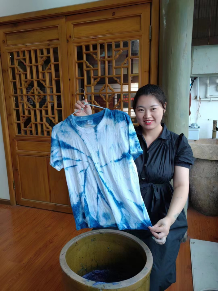 扎染是我国民间传统的独特染色工艺,历史悠久,独具艺术魅力。“作为区级扎染传统技艺传承人,早在2013年,我就开始接触扎染并开始系统学习。”蒲彩虹说,在上大学期间,她加入校园社团,学习宣传扎染文化。期间,相继跟师李延寿、谢宝高、黄静领悟扎染技艺精髓,并建立了自己的染织工作室,为社会输送染织人才。对染织技艺喜爱的当代青年,蒲彩虹不厌其烦地引导他们创作扎染作品,开发研究新型材料,提高传统技艺艺术魅力。日常调研与制作中,蒲彩虹四处寻访近50位扎染领域的老工艺匠人,在纯天然原料稀缺的条件下,精选优质的蓝草、棉纱和矿物颜料,经过全程监制打靛,建立了纯天然原料制作技术体系。结合自己的理解与审美,在蒲彩虹的巧手下,一块素白的布帛,经固定布局、锤打、汁液渗透等环节后,被赋予了新的生命。