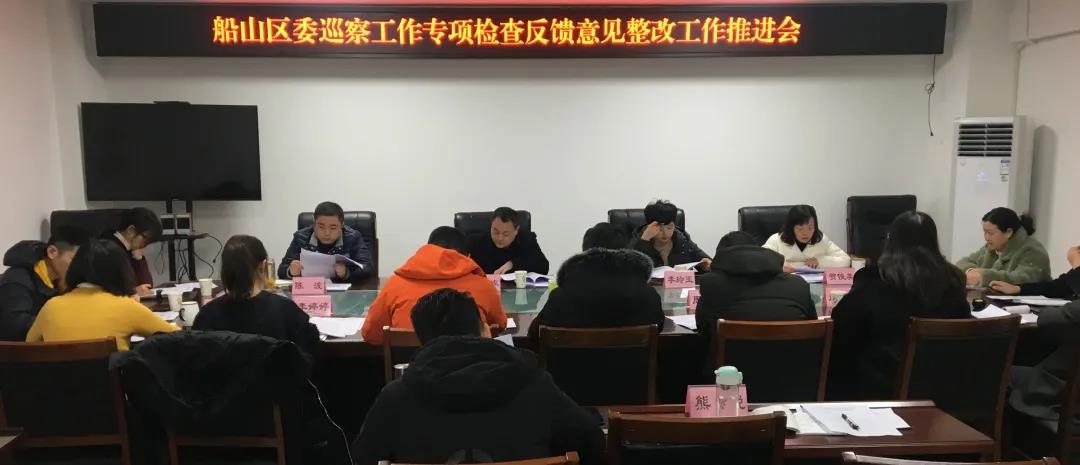 会上,区委巡察办主任贺俊美传达了《市委巡察工作领导小组办公室关于印发<关于专项检查船山区委巡察工作的反馈意见>的通知》文件精神,并介绍巡察工作专项检查有关情况。责任单位相关负责同志针对整改工作进行了发言。区委巡察工作领导小组成员围绕各自主要职责对整改工作和如何推动巡察工作提质升效进行表态发言。