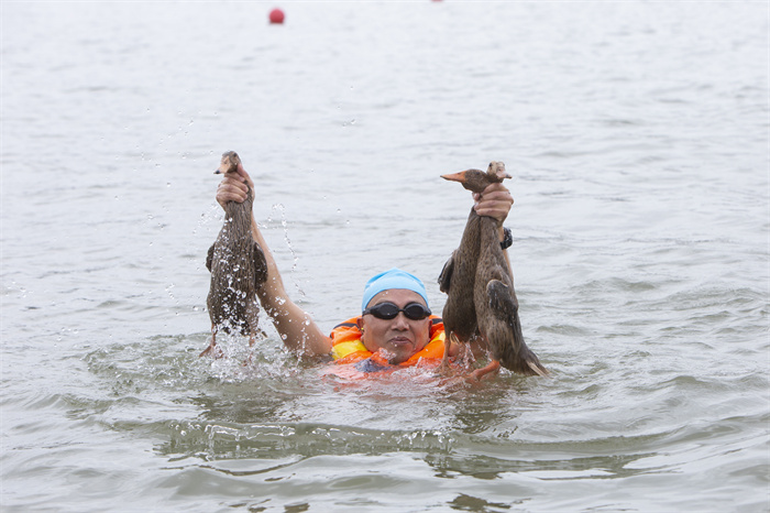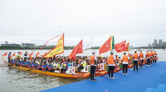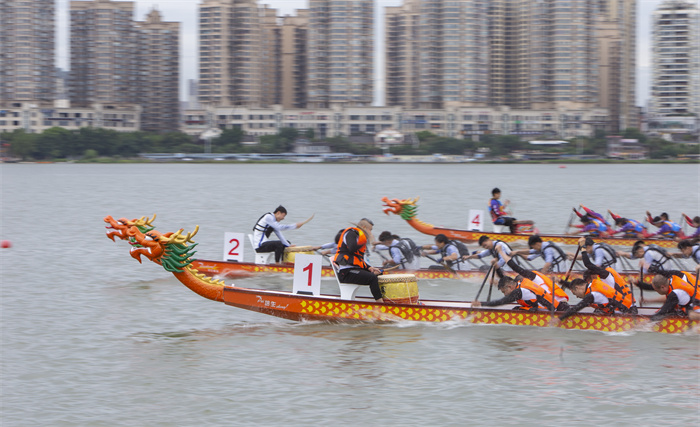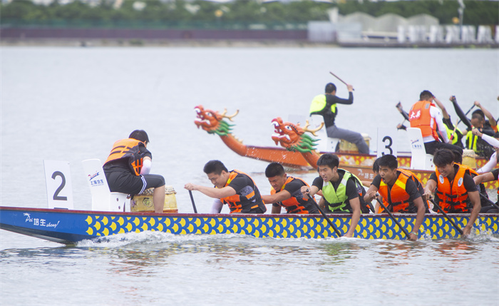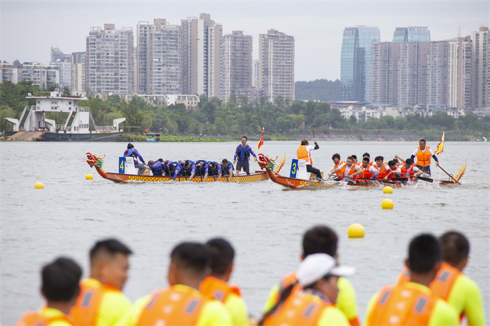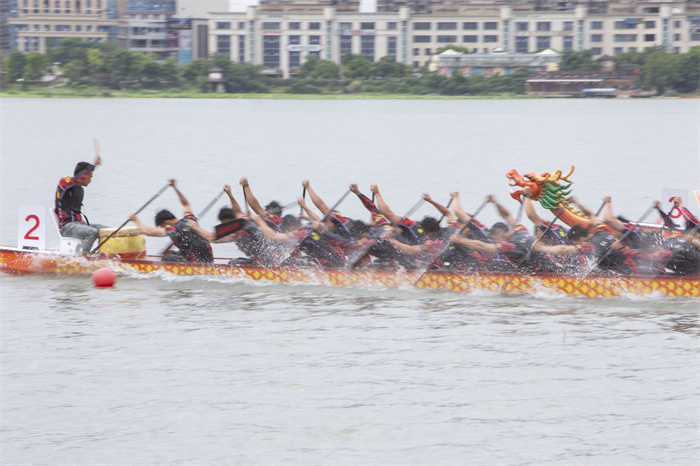 比赛在现场观众们的翘首期盼中激烈进行。青年桨手们意气风发,鼓声响起,一艘艘龙舟便如离弦的箭,在平静无波的观音湖面飞驰。“加油!加油!加油!”两岸的喝彩声响彻天空。百浆翻飞、水花四溅,湖面上荡起雪白的波浪。每一艘龙舟上的选手们都奋力划桨,争先恐后地向终点冲刺。