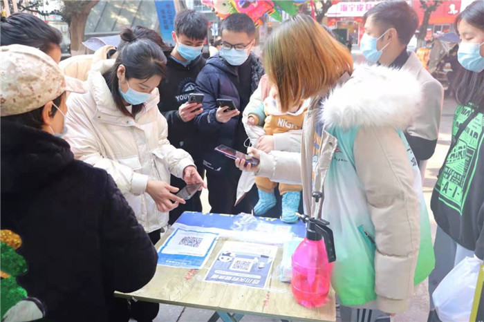 “您好,请出示您的健康码!”“用手机扫一扫这个二维码,登记身份信息,如实填报,这里就可以领取了。您是绿码,可凭此码正常出行。”在中央商务区小吃街,志愿者们和社区工作人员一起宣传推广“四川天府健康通”健康码、场所码的应用,积极引导广大群众自觉使用“四川天府健康通”,进出公共场所主动扫“场所码”、出示“健康码”,全面促进疫情防控常态化管理。