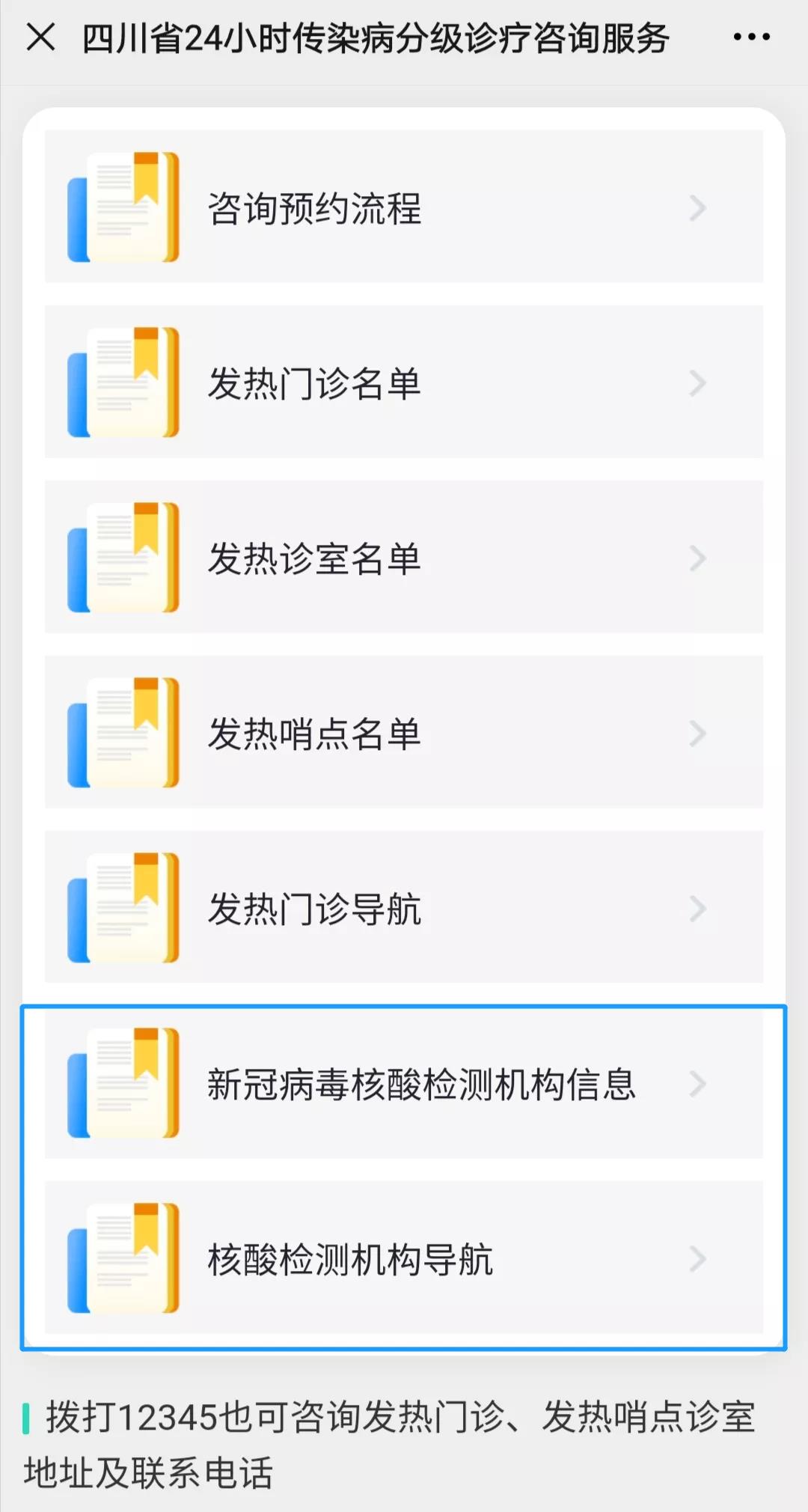 扫码关注微信公众号“健康四川官微”,点击菜单栏“疫情防控”,找到“核酸检测机构信息”栏目,点击进入即可。(也可点击文末“阅读原文”直接进入)