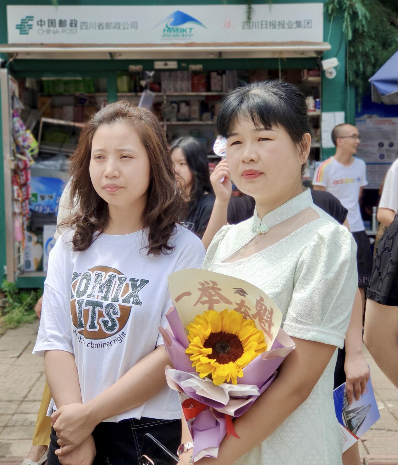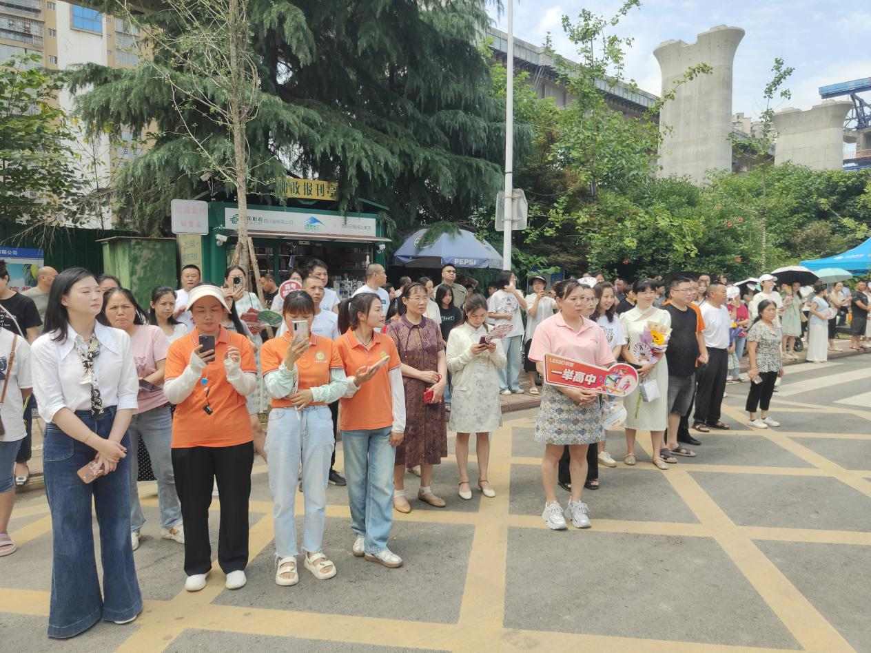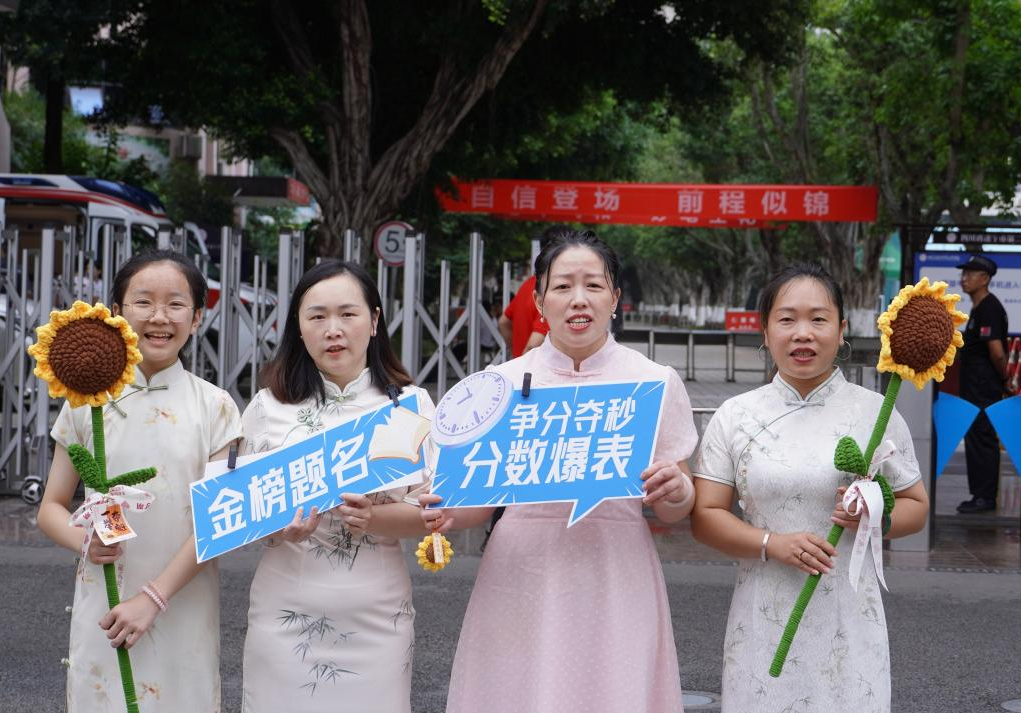 你们,温情守护在考点现场,家长和老师们殷切叮嘱、深情的拥抱,都是爱的祝福。老师们检查学生的考试证件、文具,再一次叮嘱考试要点,事无巨细。有的家长身着旗袍,寓意“旗开得胜”;有的手拿葵花,希望孩子“一举夺魁”。